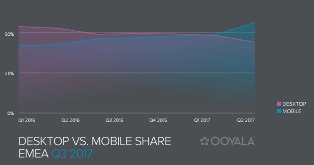 Si l’on en croit les résultats du dernier rapport Global video index publié par Ooyala, plus de 56% des vidéos lues en EMEA au cours du troisième trimestre 2017 l’ont été sur un appareil mobile, représentant une hausse de 15% par rapport au trimestre passé.