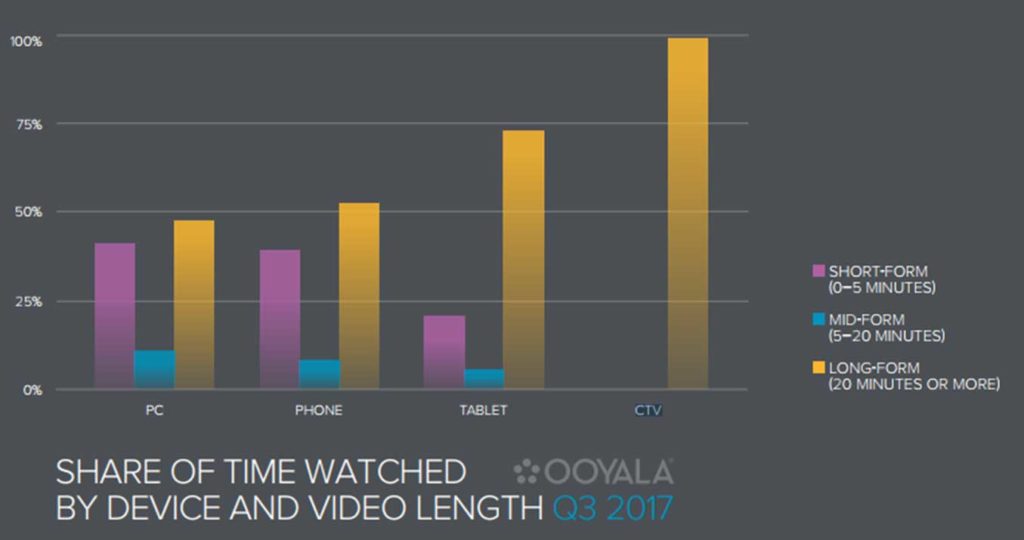 On y constate que les vidéos sont regardées quatre fois plus sur les mobiles et que quelle que soit la taille de leur écran, les jeunes et de plus en plus la génération les précédant sont plus sensibles au visionnage de vidéos longues durées (plus de 20 minutes). Les vidéos de moyenne durée, entre 5 et 20 minutes, ne cessent quant à elles de diminuer.